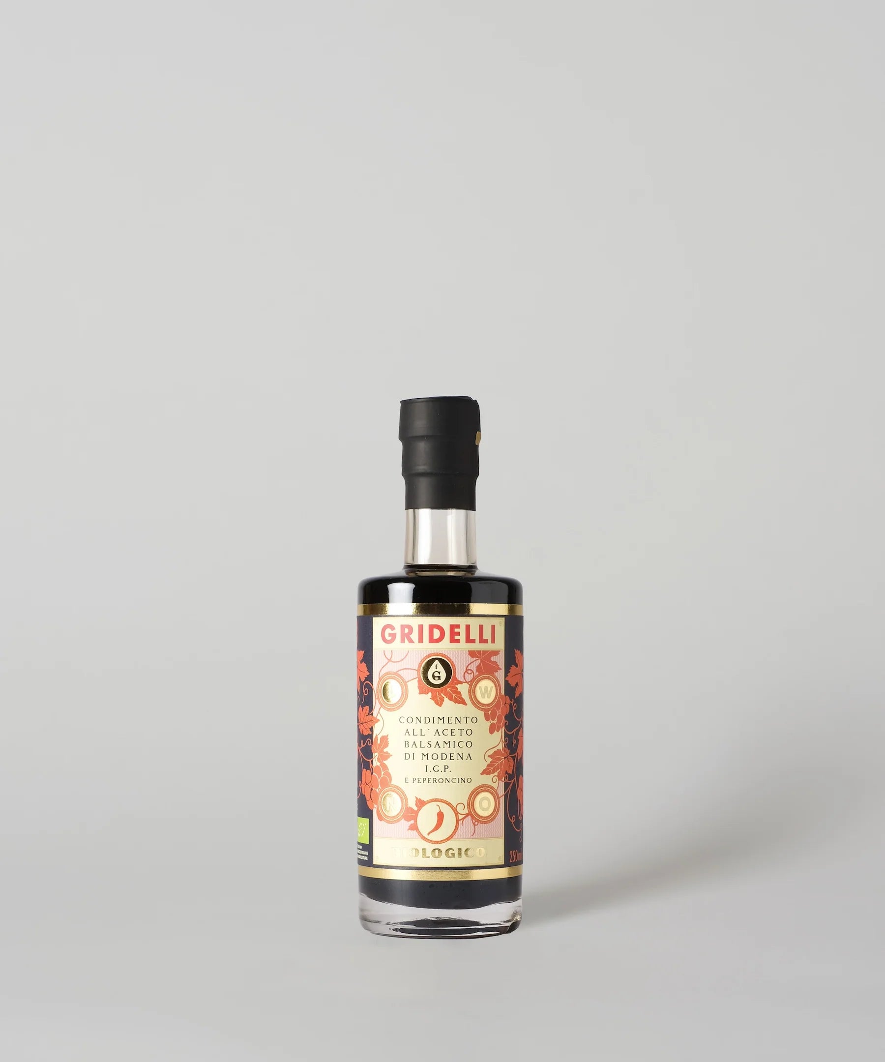 - Ingredienser: Balsamico fra Modena 90 %* (kogt druemost*, rødvinseddike*), kogt druemost 7,5 %, rødvinseddike 2 %, chilipulver 0,3 %*, naturlig peperoncino-aroma 0,2 % (*økologisk ingrediens)