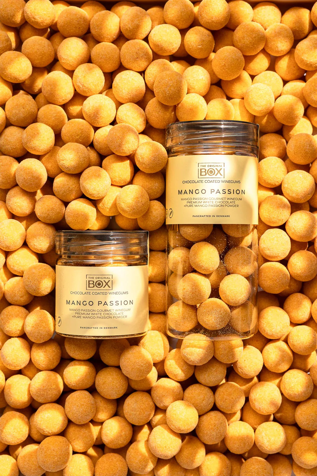 Box The Original-serien er kendetegnet ved sit raffinerede samspil mellem tekstur og smag – fra den elastiske vingummikerne til den cremede chokolade og det aromatiske frugtpulver. Mango/passion-varianten fremstår særligt frisk og tropisk i udtrykket med en livlig syre og en dessertlignende lethed. Resultatet er moderne luksuskonfekt, velegnet som værtindegave, til kaffe eller som et farverigt og smagfuldt indslag på dessertbordet.