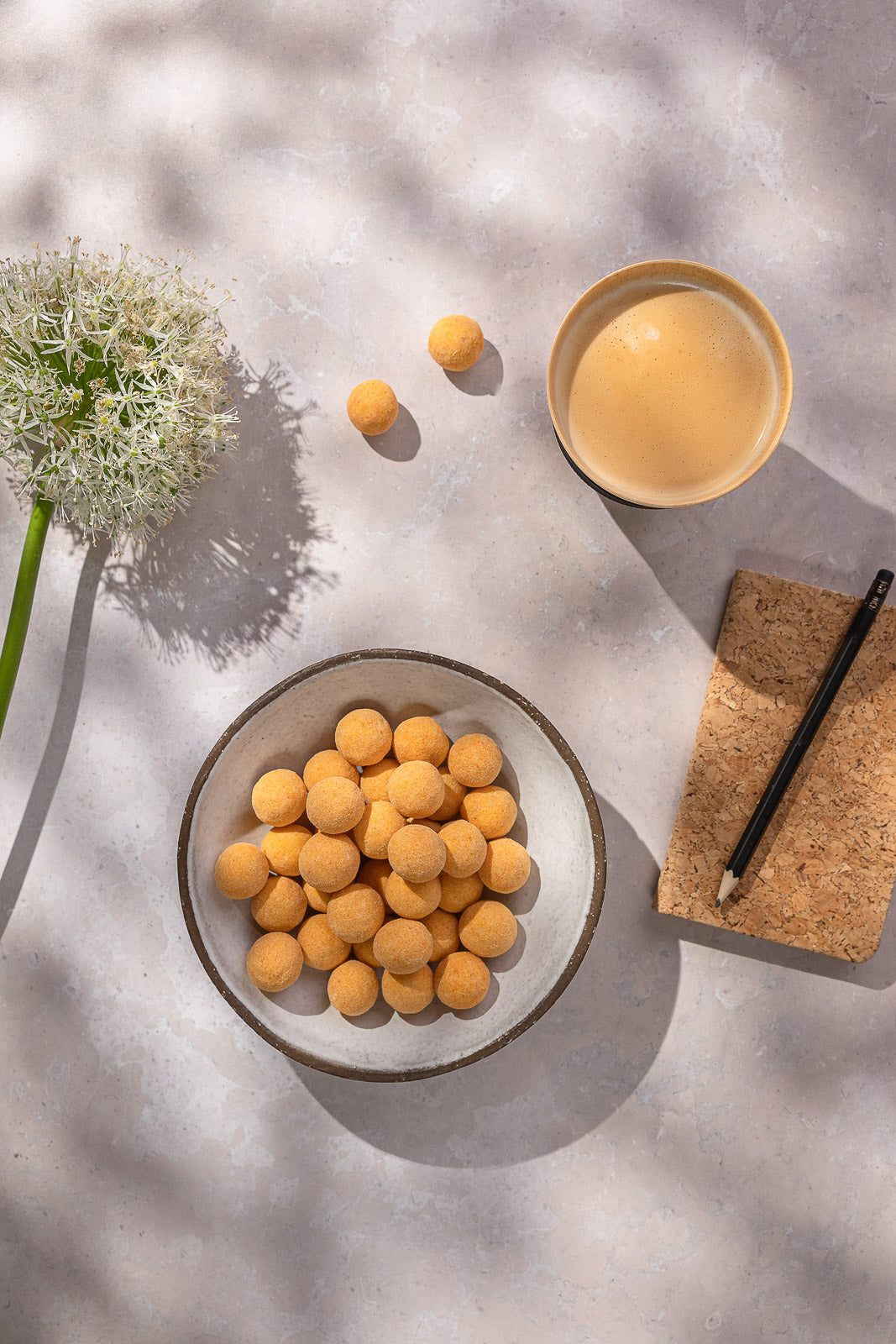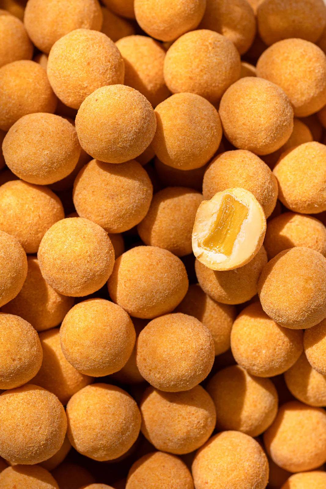 Kernen består af gelatinefri vingummi med naturlig sødme og frisk syre fra mango og passionsfrugt. Den er overtrukket med premium hvid chokolade med mindst 29,8 % kakaotørstof, hvilket giver en silkeblød struktur og en afrundet sødme med fine vaniljenoter. Kuglerne rulles efterfølgende i frysetørret mango- og passionspulver, som tilfører intens frugtaroma og en let syrlig kontrast til chokoladens fedme.