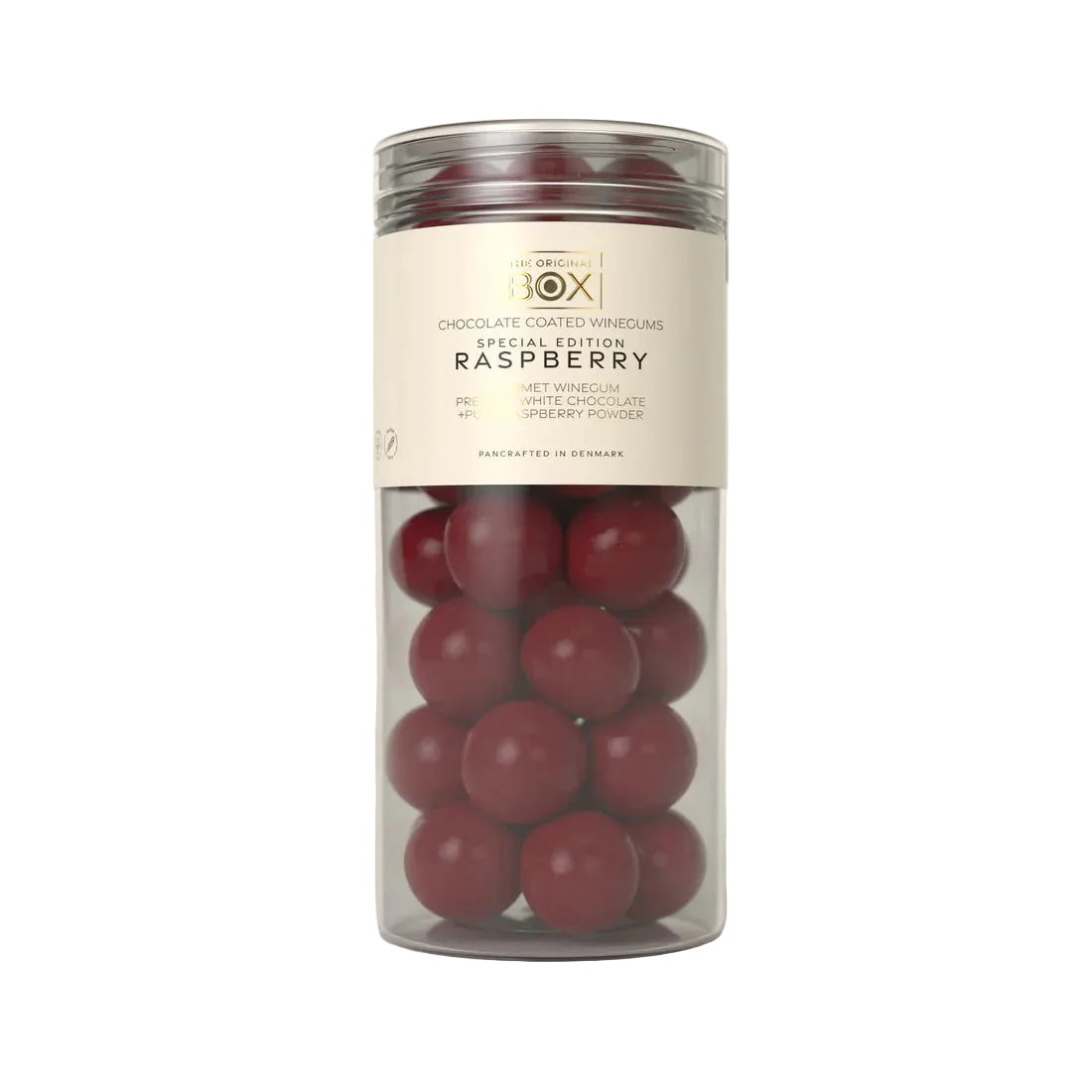 Box The Original-serien er kendetegnet ved sit raffinerede samspil mellem tekstur og smag – fra den elastiske vingummikerne til den cremede chokolade og det aromatiske frugtpulver. Hindbærvarianten fremstår særligt frisk og frugtcentreret med en let og elegant afslutning. Resultatet er en moderne luksuskonfekt, velegnet som sofistikeret snack, til kaffe eller som en udsøgt gave.