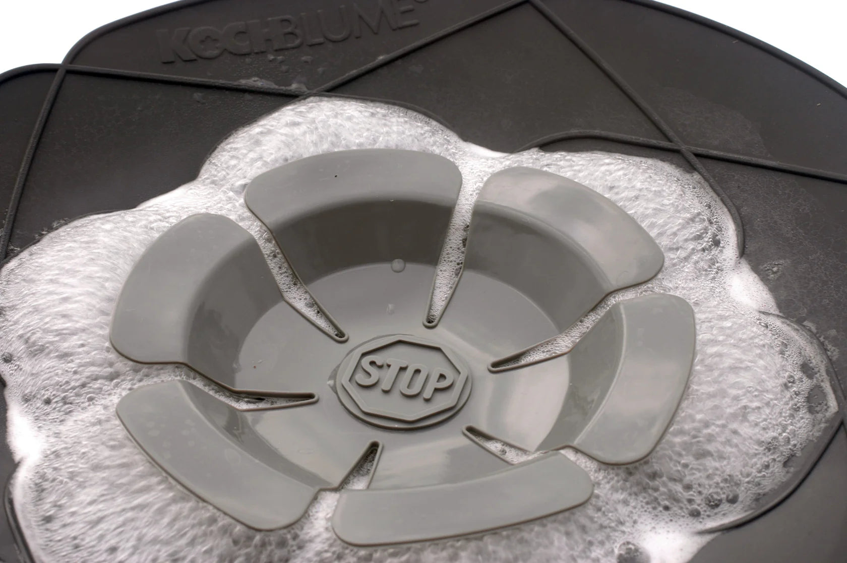 Med det smarte Kochblume universallåg slipper du for overkogte gryder og spruttende vand på komfuret. Låget er fremstillet i patenteret silikone og passer til de fleste gryder mellem 14 og 24 cm i diameter. Det er et multifunktionelt låg, der både fungerer som overkogningssikring, stænklåg og dampkoger – alt i ét elegant design.