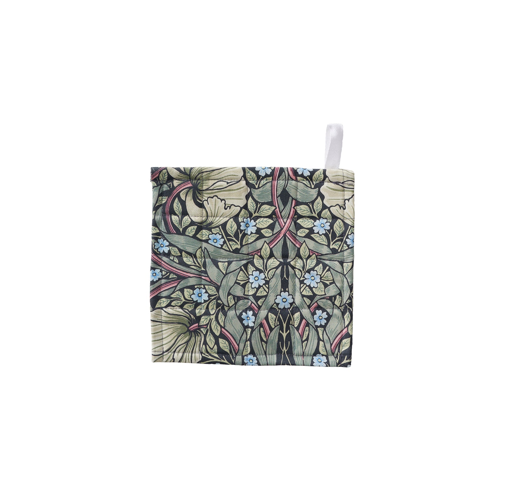 Den er fremstillet i 100% bomuld og dekoreret med et klassisk og naturinspireret William Morris-mønster, som tilføjer et elegant og kunstnerisk præg til dit køkkentilbehør. Perfekt til dig, der ønsker at beskytte hænderne mod varme og samtidig skabe stemning omkring madlavningen – både ude og inde.