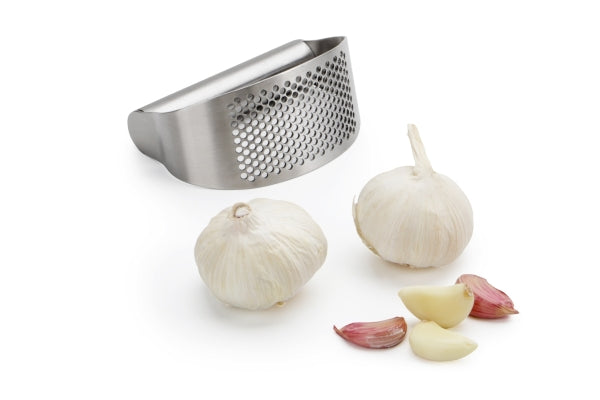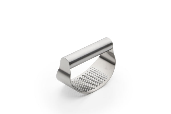 Hvidløgspressen i rustfrit stål er et innovativt køkkenredskab, der gør det nemt og hurtigt at knuse hvidløg. Den er designet til at blive betjent direkte mod et skærebræt eller en bordplade, hvilket sikrer en jævn og kontrolleret presning. Med sin enhåndsbetjente form er den både effektiv og brugervenlig.