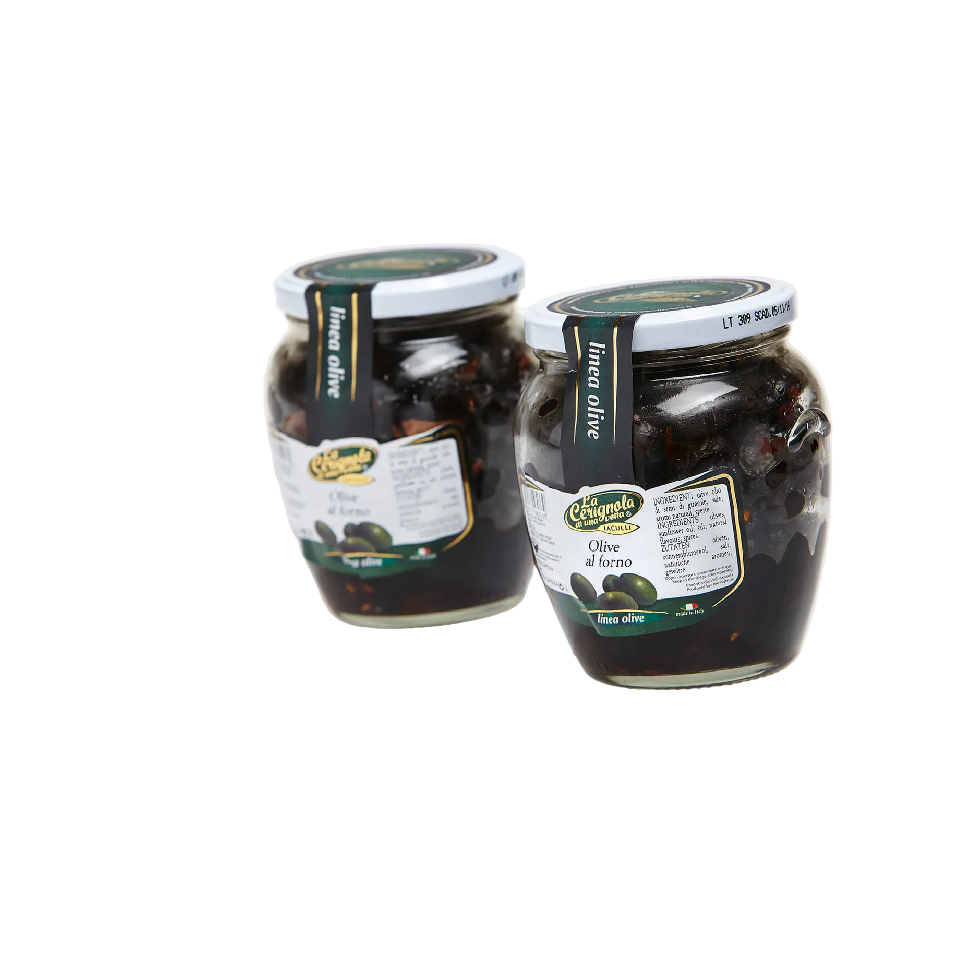 Olive al forno fra La Cerignola di una Volta er sorte, saltbagte oliven fra Apulien i det sydlige Italien – en klassisk specialitet med intens og koncentreret smag. Olivenerne bages nænsomt med salt, hvilket trækker en del af væsken ud og samtidig forstærker både tekstur og naturlig umami. Resultatet er en fast, let rynket oliven med dyb, aromatisk karakter og en elegant, vedvarende saltsmag.