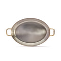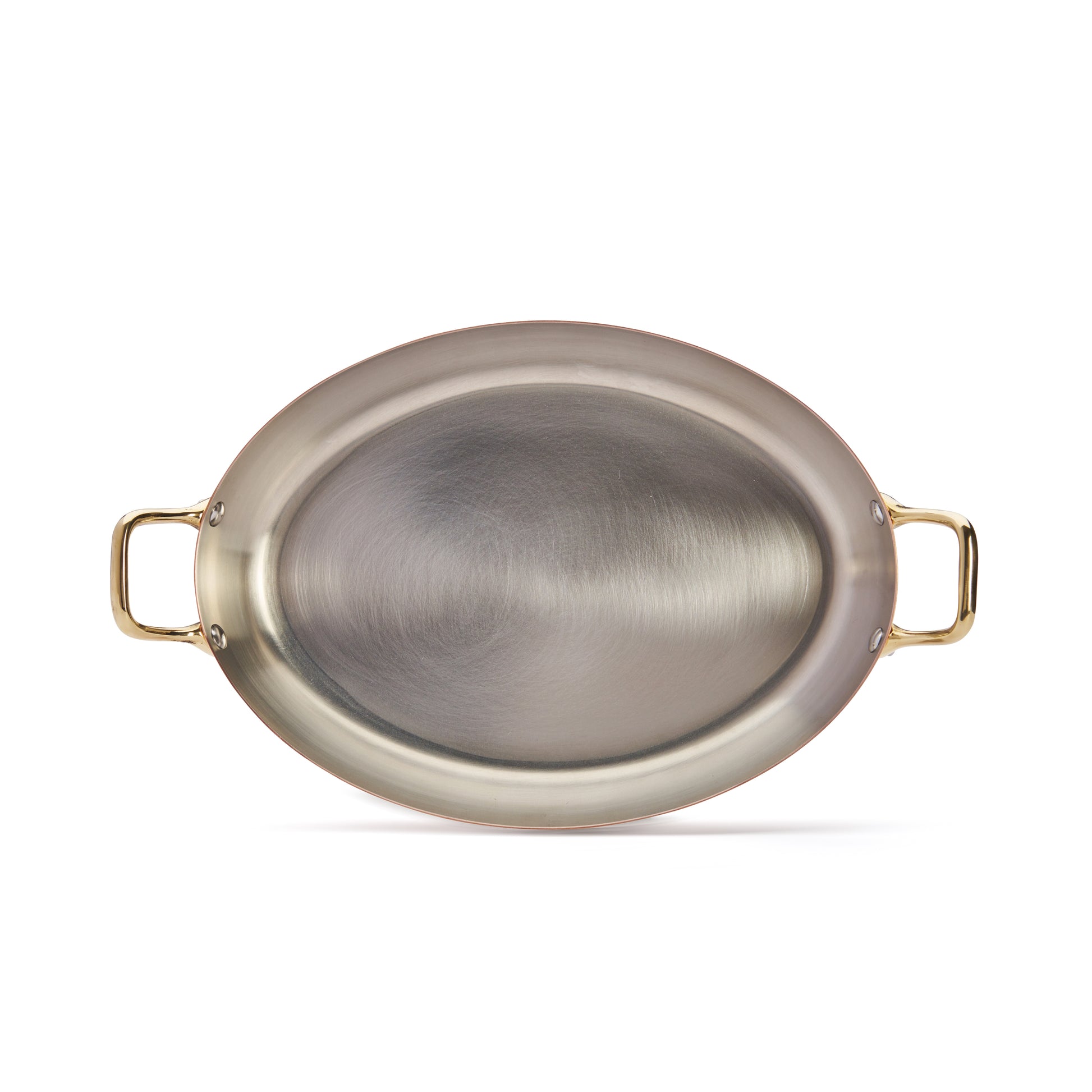 Oval stegefad i kobber og rustfrit stål med messing greb
