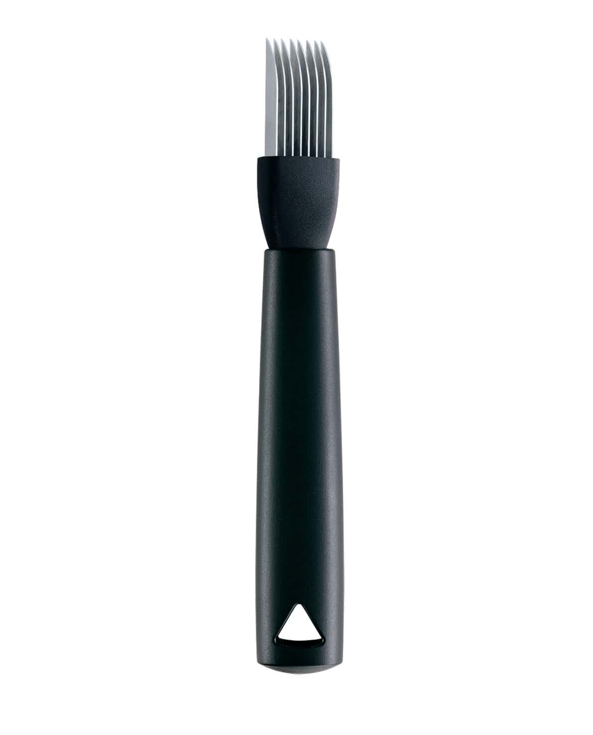 Snittekniven fra Triangle med 8 parallelle klinger er det perfekte værktøj til at skabe dekorative grøntsagsfjer på få sekunder. Med ét enkelt snit kan du forvandle syltede agurker, porre eller forårsløg til ultrafine strimler – ideelle til salater, garnering, sushi eller asiatiske retter. De skarpe, rustfri klinger er præcist justeret og arbejder i perfekt harmoni for et ensartet og professionelt resultat.