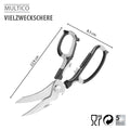 - Funktioner: Saks, flaskeåbner, skruelågsåbner (op til Ø30 mm), nøddeknækker og fjerkræsaks